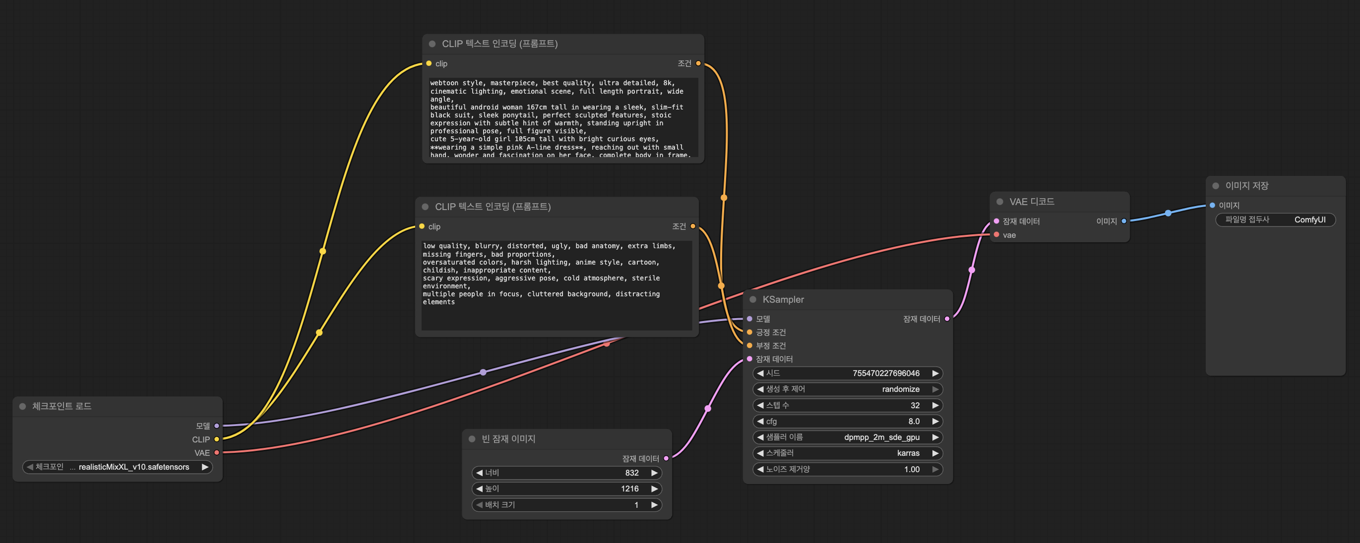 눈이 큰 캐릭터를 그다지 좋아하지 않아서.. ㅎㅎ Lora의 경우는 'Realistic Vision XL Anime Blend' 류로 선택.